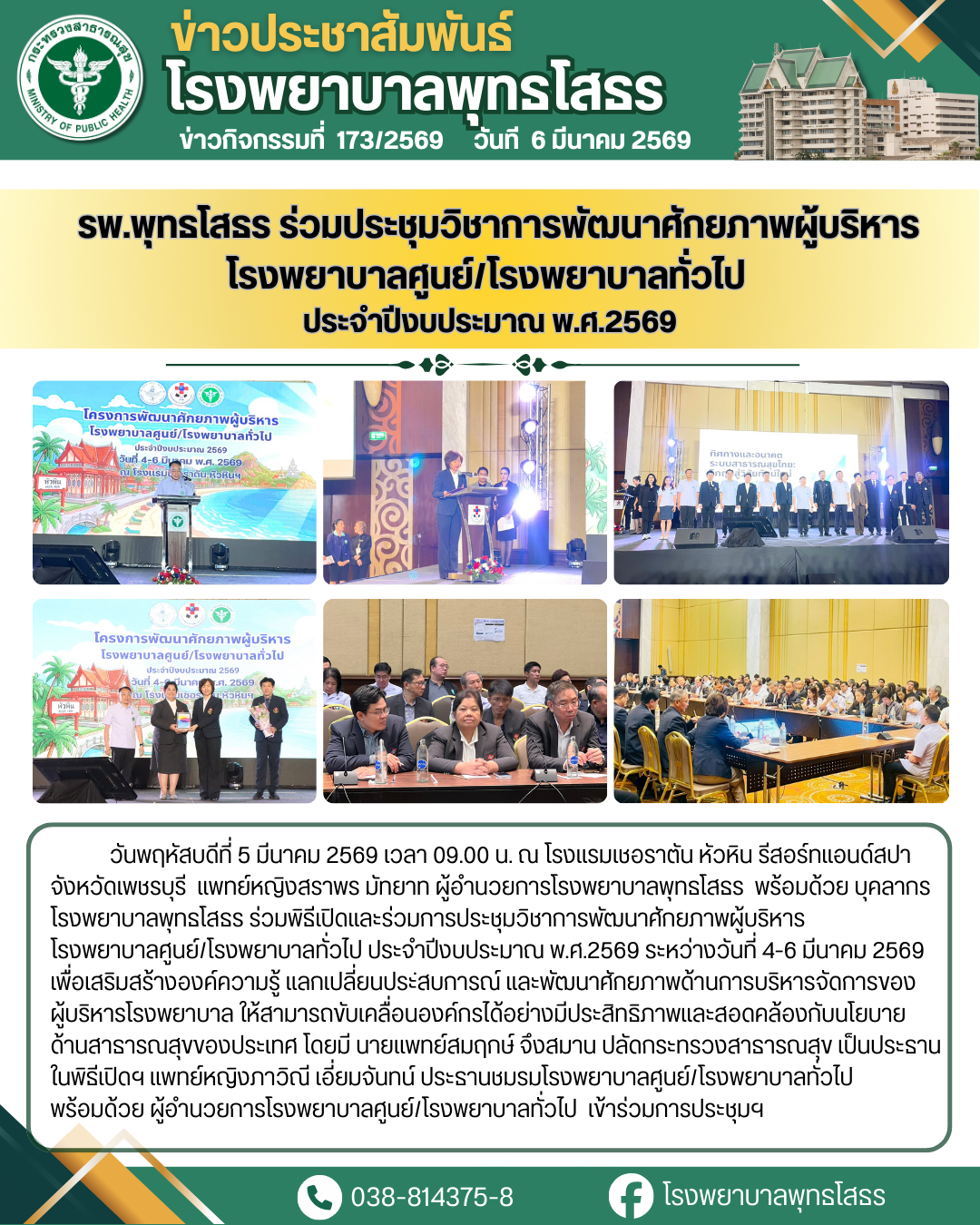 ย้อนกลับ6 มีนาคม 2569รพ.พุทธโสธร ร่วมประชุมวิชาการพัฒนาศักยภาพผู้บริหาร โรงพยาบาลศูนย์/โรงพยาบาลทั่วไป ประจำปีงบประมาณ พ.ศ.2569
